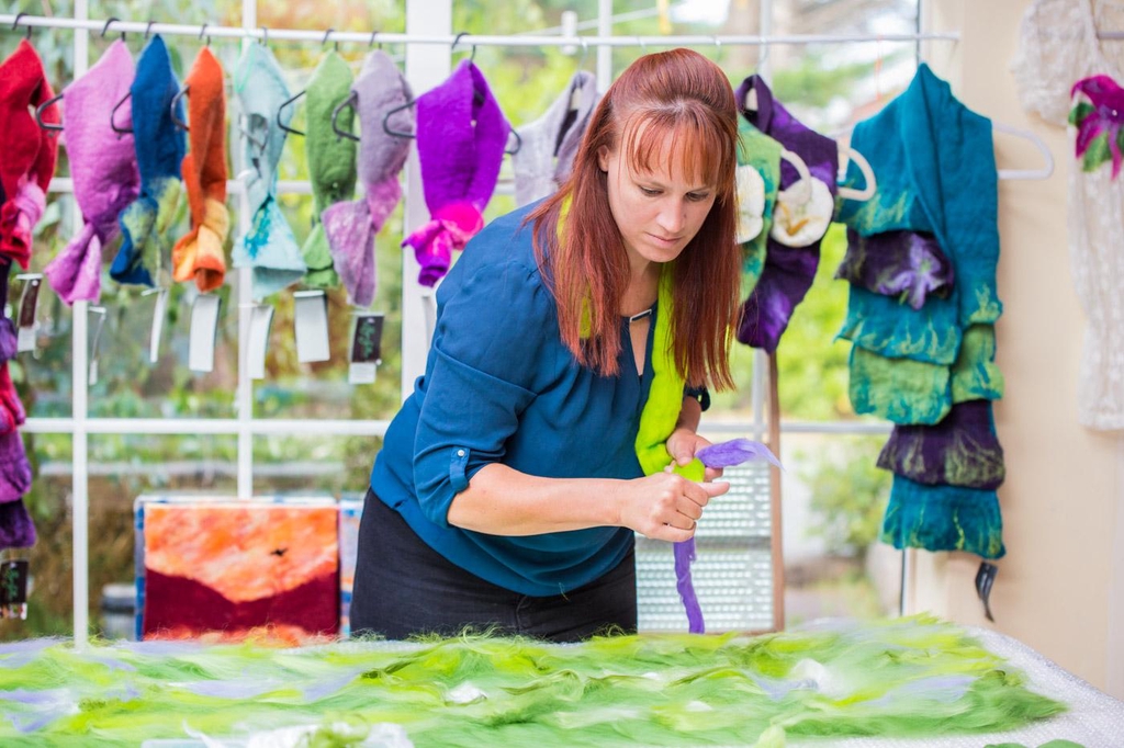 Her use of colour and texture give the wearer a connection to the land. From Sea Blues to Landscape Greens and Mountain Heather Purples, Jayne's range is very distinct. The textures of felt and use of silks merge to create a landscape story within each piece.