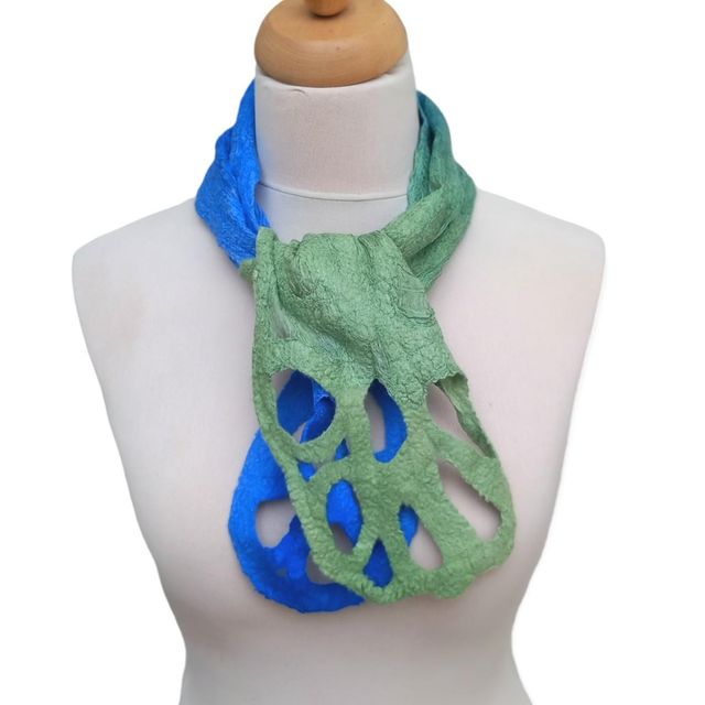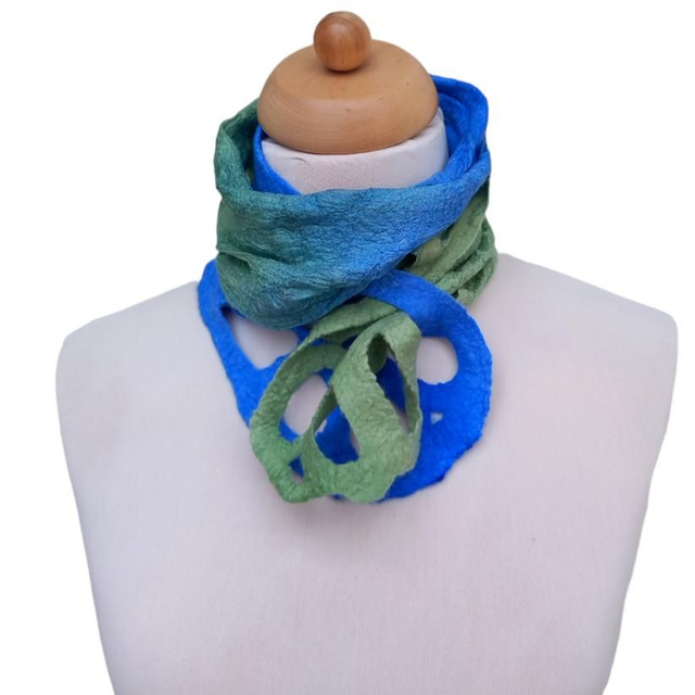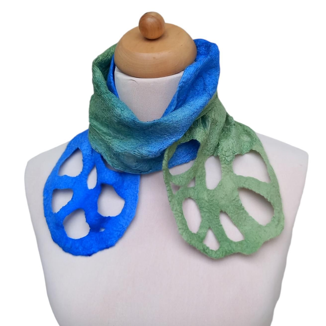 Made with fine margilan silk and fine soft merino wool. This is a hand made item using the nuno felting method and hand painted with eco friendly silk and wool dye.